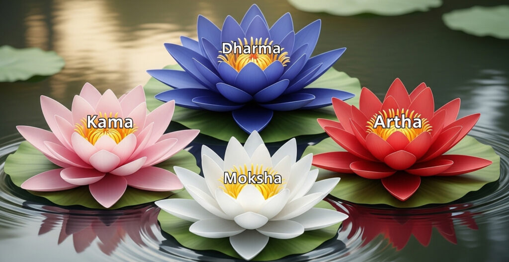 तस्वीर: चार कमल के फूल जिन पर धर्म, अर्थ, काम और मोक्ष अंकित हैं, जो जीवन के संतुलित उद्देश्य दर्शाते हैं।