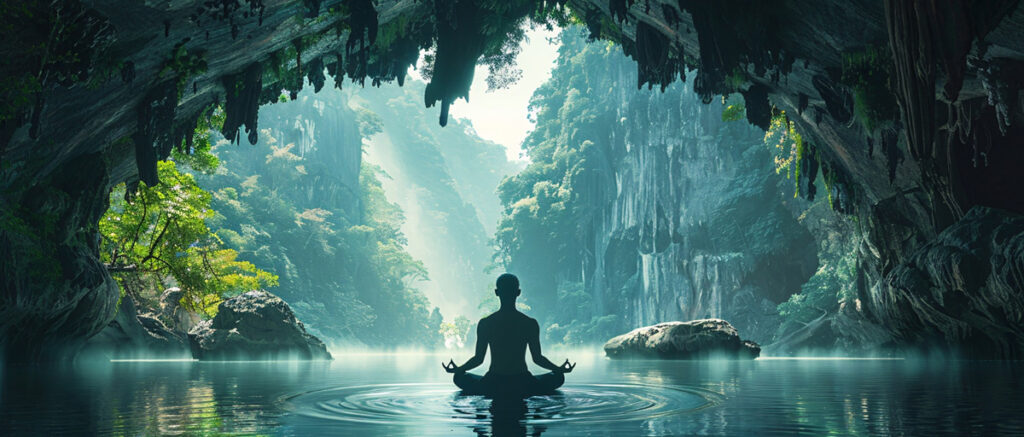 तस्वीर: एक व्यक्ति एक विशाल ब्रह्मांडीय वृक्ष के नीचे ध्यान लगाते हुए, जिसकी शाखाएं और जड़ें आपस में जुड़ी हुई हैं, जीवन की एकता दर्शाती हैं।